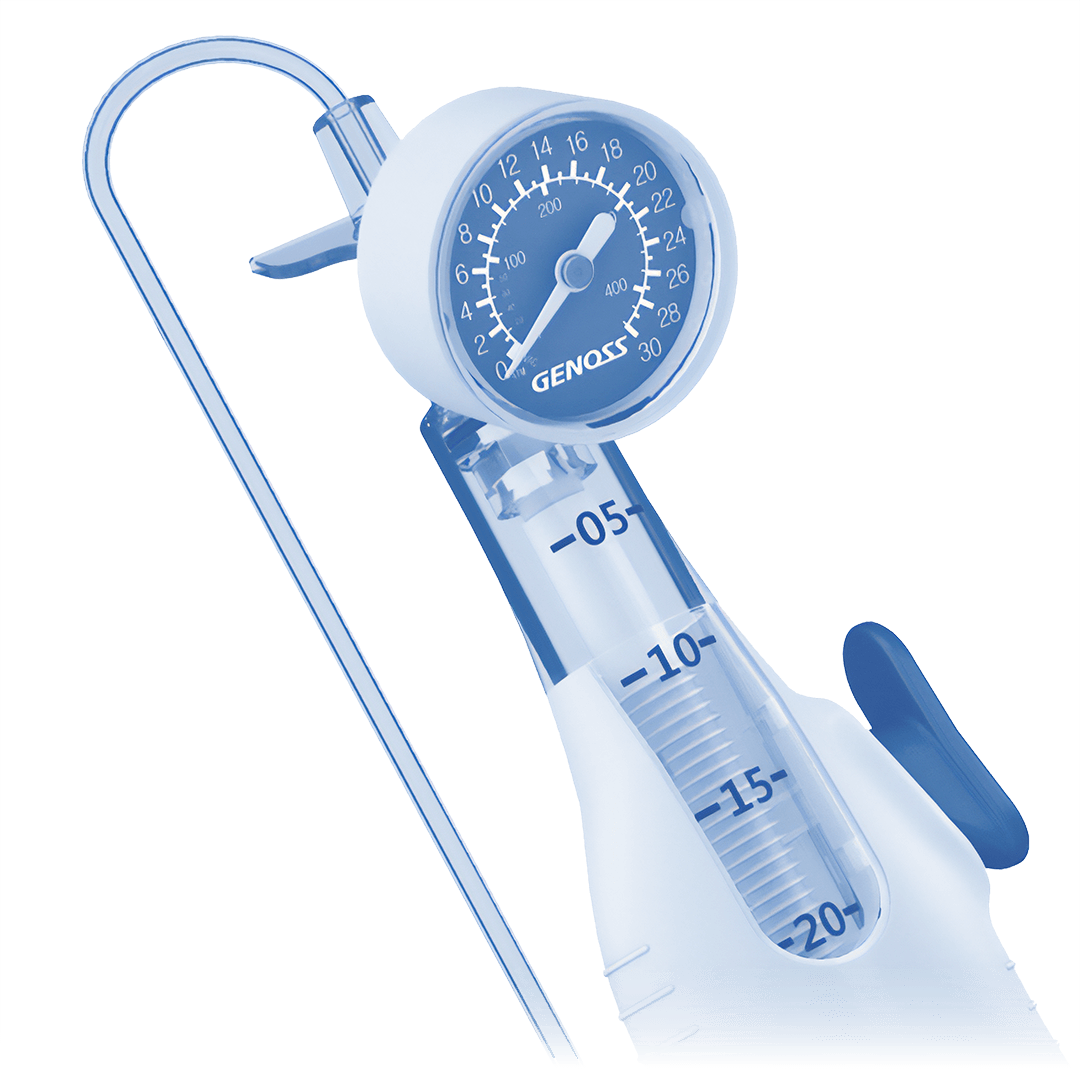 The GENOSS B30 inflator is a high-precision inflator designed to provide optimal control in procedures requiring the use of balloon catheters. Its ergonomic and compact design allows for comfortable and secure handling, while its 20 cc capacity and maximum pressure of 30 atm ensure effective performance. The GENOSS B30 inflator includes a button-type locking and release system, a rotation lock function, and a clear display to facilitate air bubble removal. All these features make it an indispensable device for daily clinical use.