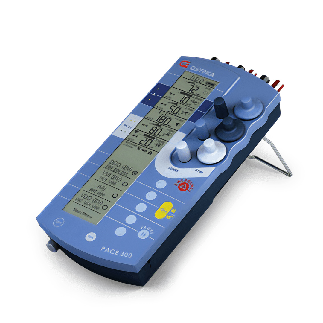The OSYPKA PACE 300® is a three-chamber external pacemaker designed for temporary biventricular pacing, particularly suited to optimising left ventricular (LV) haemodynamics. It is a key tool in the management of heart failure and other critical conditions. The versatile design of the OSYPKA PACE 300® allows use as a single-, dual-, or triple-chamber pacemaker, adapting to various clinical needs.
